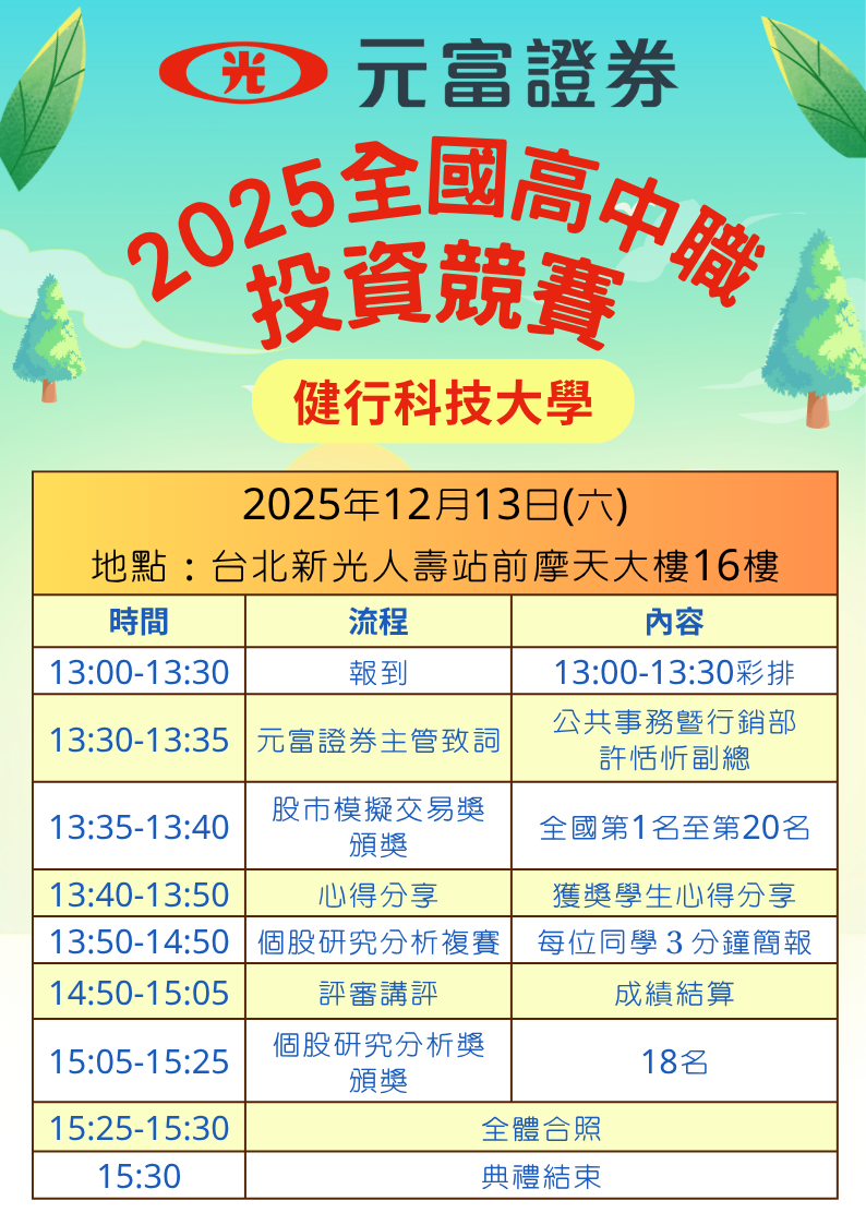 竞赛目的 透过竞赛的过程,培养学生具备正确之投资理财观念,并激发高中职学生之投资兴趣及热诚。 参与本竞赛的同学,将发给参赛证明。 主办单位、协办单位、赞助单位 主办单位:元富证券股份有限公司 执行单位:健行科技大学财务金融系、宝硕财务科技股份有限公司 参与对象 全国各高中职学生 投资标的及投资组合规定 投资种类(标的):上市股票、上柜股票、ETF 原始投资金额:NT$ 2,000,000 投资组合规定:可选择上市或上柜之个股商品进行投资,但每日投组总持股比率须达总净值『七成(含)』以上。股票不可融资融券,以期间『总报酬率』最高者为胜。相关竞赛规则请参考附件。 竞赛奖励 【股市模拟交易奖】 取最佳绩效前五名,颁予奖金与奖状: 第一名10,000元 第二名5,000元 第三名3,000元 第四名2,000元 第五名1,000元 【个股研究分析奖】 由元富证券团队进行评选,颁予奖金与奖状: 第一名5,000元 第二名4,000元 第三名3,000元 优选奖五名,每名2,000元 佳作奖十名,每名1,000元 竞赛重要日程 【股市模拟交易奖】 报名(试玩)期间:2025年8月11日~2025年10月9日。 正式竞赛期间:2025年10月13日~2025年11月14日。 颁奖日期:2025年12月13日。 【个股研究分析奖】 初赛缴件:2025年12月1日前提供投影片档案。 (电子档案请直接传给Line官方) 复赛公告:2025年12月5日中午12点。 复赛日期:2025年12月13日至台北新光人寿站前摩天大楼进行3分钟口头报告。 颁奖日期:2025年12月13日。 报名方式 步骤1️⃣:表单报名👉https://forms.gle/55WWCDEvurgiXW9L6 步骤2️⃣:经资格审核通过,将会以活动Line官方帐号发放投资帐密给参赛同学!请加入Line官方帐号 👉https://lin.ee/HC6W5jN ![]() |