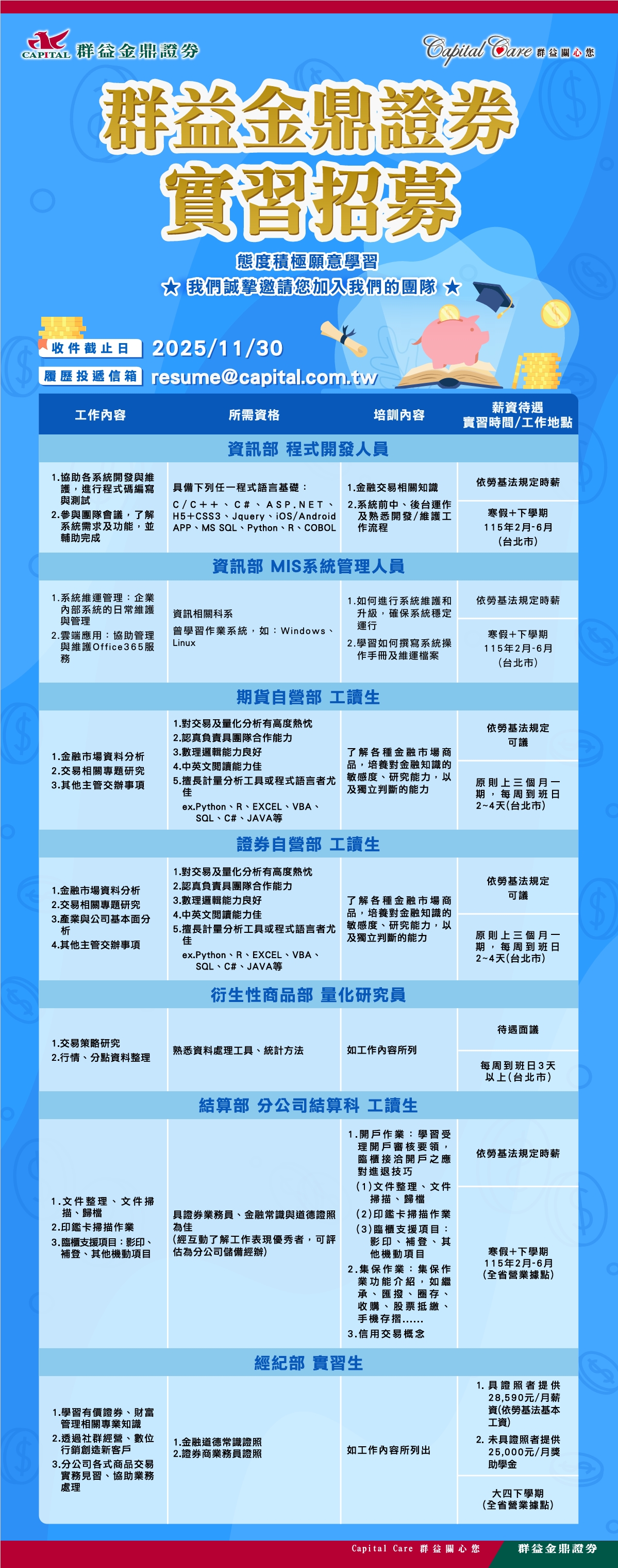 【校外實習公告】群益金鼎證券 114-2學期實習計畫==>報名截止日:11/30